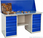 Двухтумбовый. Допустимая нагрузка на столешницу 1000 кг. Опорные элементы выполнены сварными из холоднокатаной стали. Для выполнения сборочных, ремонтных, слесарных, монтажных и других видов работ на производстве, в сервисных центрах, мастерских, гаражах, а также для обучения технологии в учебных заведениях. Комплектуется полкой-стенкой, расположенной под столешницей для удобного размещения габаритного инструмента и оснастки. Размеры верстака: 855x1596x696 мм. Вес: 123 кг. Поставляется в 4 комплектациях на выбор.