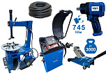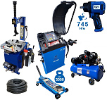 Комплект: шиномонтажный станок TS-21 для дисков: внешний 11÷20” + пистолет с манометром для подкачки шин + монтажка + пластиковые накладки на зажимные кулачки + регулятор давления с влагоотделителем и манометром. + TS-500 балансировочный станок с автозапуском, для колес легковых автомобилей и легких грузовиков, диаметр диска с резиной до 760 мм. размеры диска: ширина 3"–9” (76-228 мм), диаметр диска  10"–21” (254-533 мм). + кожух защитный + клещи + кронциркуль + быстрозажимная гайка + набор конусов + подкатной домкрат г/п 3,0т. 130-465мм. + ударный пневмогайковерт 1/2" крутящий момент 745Нм +  шланг кислородный 9мм 20Атм. 10м