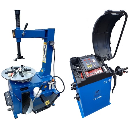 Комплект: шиномонтажный станок TS-21 для дисков: внешний 11÷20” + пистолет с манометром для подкачки шин + монтажка + пластиковые накладки на зажимные кулачки + регулятор давления с влагоотделителем и манометром. + TS-500 балансировочный станок с автозапуском, для колес легковых автомобилей и легких грузовиков, диаметр диска с резиной до 760 мм. размеры диска: ширина 3"–9” (76-228 мм), диаметр диска  10"–21” (254-533 мм). + кожух защитный + клещи + кронциркуль + быстрозажимная гайка + набор конусов + подкатной домкрат г/п 3,0т. 130-465мм. + ударный пневмогайковерт 1/2" крутящий момент 745Нм +  шланг кислородный 9мм 20Атм. 10м
