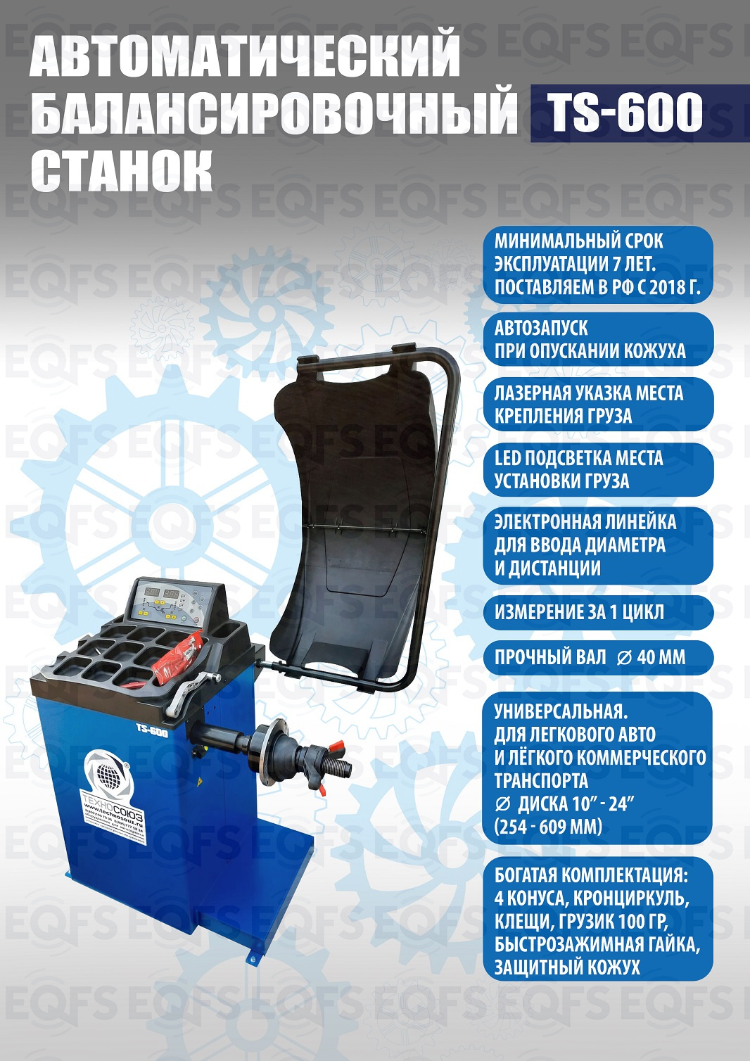 TS-600 Балансировочный станок автоматический. Автоматический ввод дистанции и диаметра диска. Остановка и фиксация колеса в месте установки грузика. Лазерная указка места установки грузика на 6 часов. Старт опусканием кожуха или с кнопки. Для колес легковых автомобилей, мотоциклов и легких грузовиков с диаметром диска с резиной до 800 мм. Размеры диска: ширина 3–10” (76-254 мм), диаметр диска 10–24” (254÷609 мм). Вал- 40мм. Гарантия 18 мес – наш монтаж, 12 мес – самостоятельная установка. В комплекте: кожух с автозапуском + клещи + кронциркуль + быстрозажимная гайка + набор конусов.