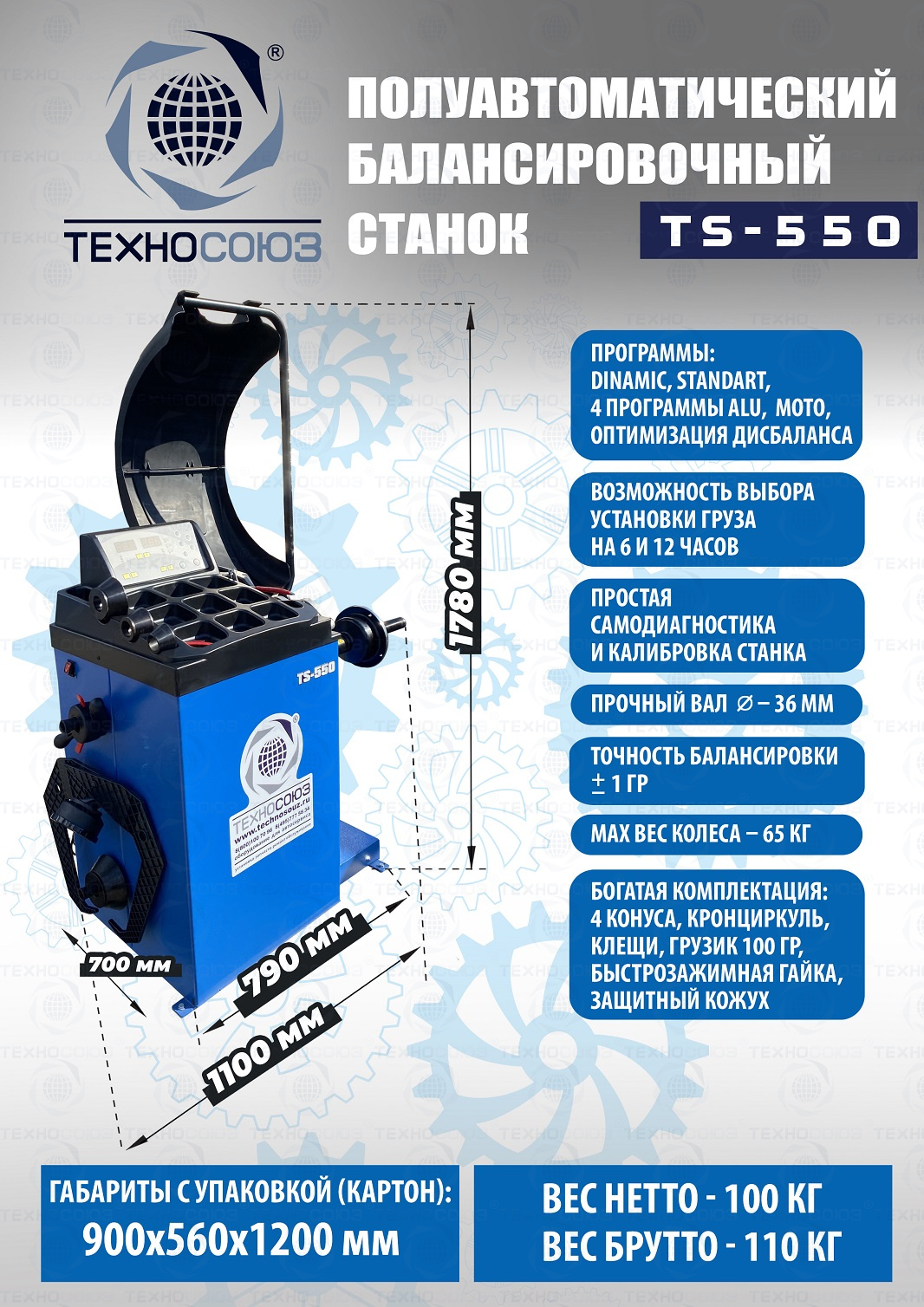 + TS-550 Балансировочный станок (с лазером) Полуавтомат. Удобный и понятный интерфейс. Автозапуск опусканием кожуха. Автоматический ввод дистанции и диаметра диска. Лазерная навигация. Автокалибровка. Для колес легковых автомобилей, мотоциклов, «Газелей», «Спринтеров» с диаметром диска с резиной до 800 мм. Размеры диска: ширина 3–10” (76-254 мм), диаметр диска 10–24” (254÷609 мм). Вес ≤ 65 кг. Вал- 36 мм. Точность ±1гр. 220 В. Режимы работы DINAMIC, STATIC, ALU1, ALU2, ALU3, ALUS, ST. Гарантия 12 мес. В комплекте: кожух с автозапуском + клещи + кронциркуль + быстрозажимная гайка + набор конусов.