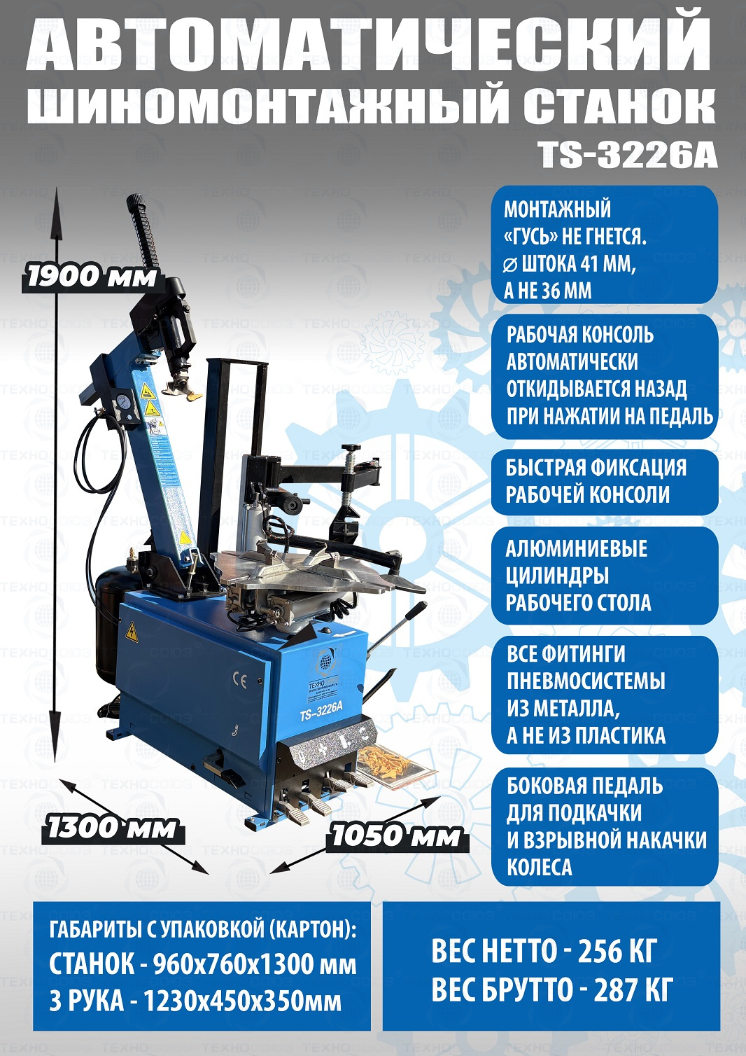 Автоматического шиномонтажного стенда TS-3226А предназначен для монтажа и демонтажа шин легковых автомобилей, внедорожников и легких грузовиков с размером колес от 11-24 дюйма. Усилие пневмоцилиндра в 2500 кг. В комплекте: полноценная 3-й рука для работы с жесткой и низкопрофильной резиной RUNFLAT. + встроенный бустер  24 литра (взрывная подкачка) + пистолет для подкачки шин + монтажка + регулятор давления с влагоотделителем и манометром. Напряжение шиномонтажных станков 220В или 380В на выбор.