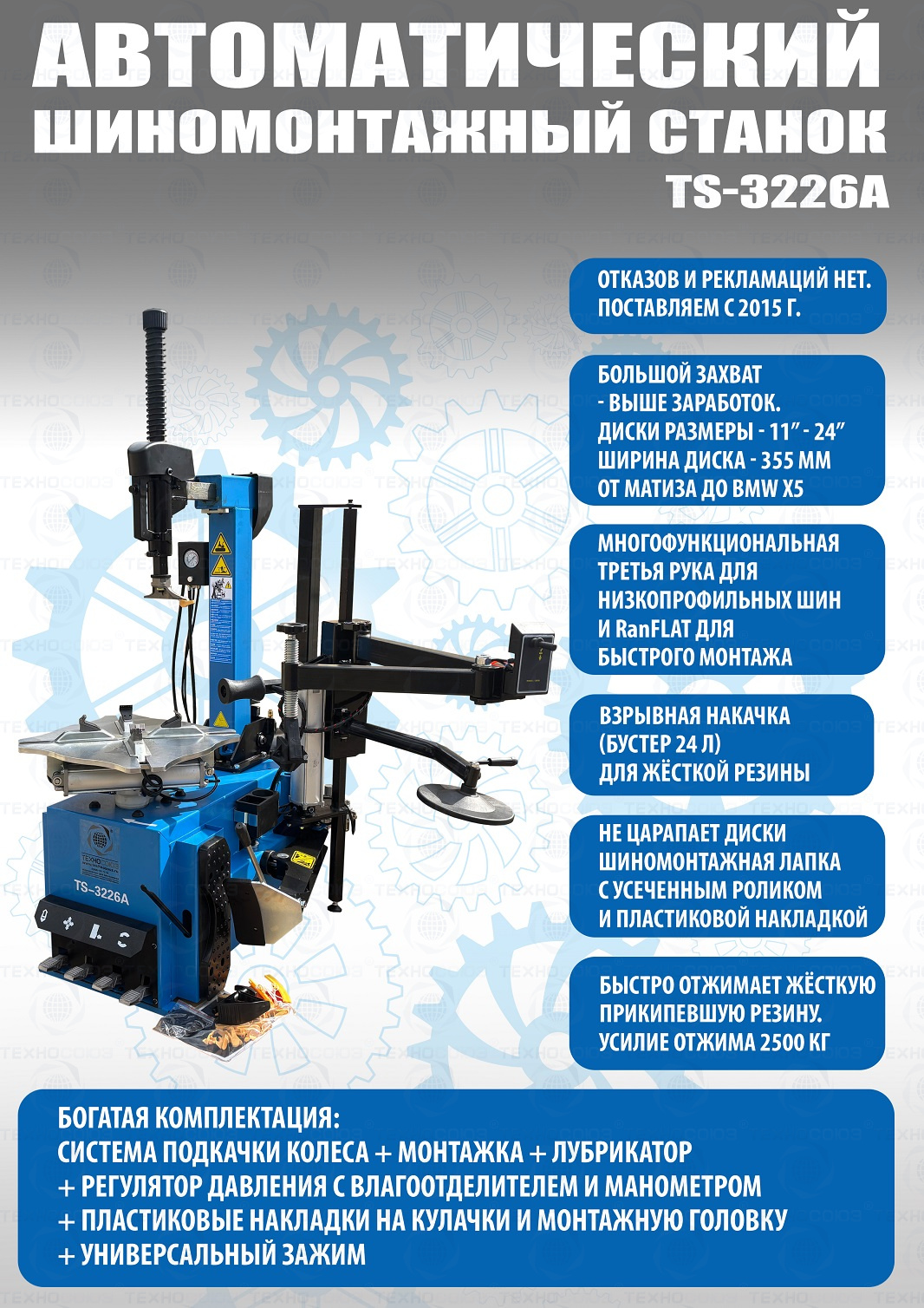 Автоматический шиномонтажный станок TS-3226A Оптимальный вариант цена/функционал. Самый продаваемый автоматический станок! + встроенный увеличенный бустер емкостью 24 литра (взрывная подкачка) + третья рука для работы с низкопрофильными шинами и RanFlat. Для колес легковых автомобилей, легких грузовиков, микроавтобусов и коммерческой техники. Внешний зажим 11-21”. Внутренний зажим 12-24”. Поставляем на 220В и 380В.
