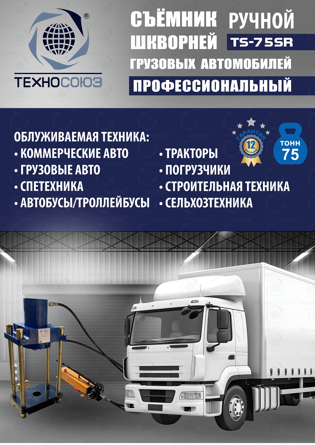 Максимальный диаметр шкворней - 60 мм (для выпрессовки шкворней практически на любых грузовых автомобилях и спецтехники)